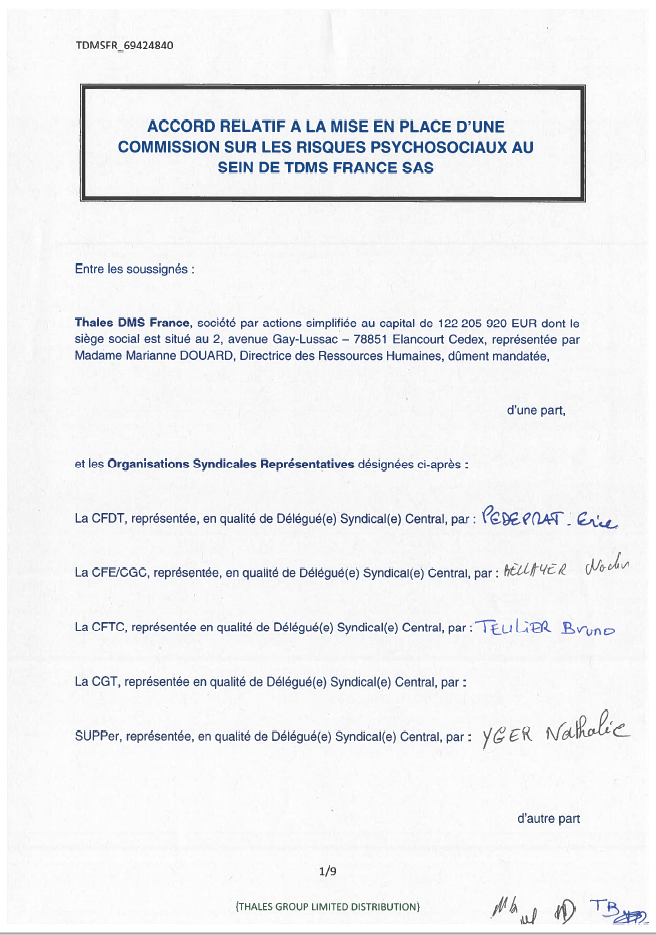 Accord Relatif à la mise en place d'une commission sur les Risques Psychosociaux au sein de Thales DMS