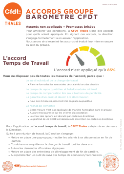 Crée le 26/03/2026 / Par Arnaud BOURRÉELa CFDT Thales a évalué le degré d’application de chaque Accord Groupe. Plusieurs actions ont découlé de cette analyse. Tout d’abord, une mise en demeure pour l’application de l’accord temps de travail. Ensuite, l’élaboration d’un baromètre qui note chacun des accords.