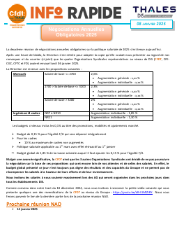 Crée le 08/01/2025 / Par Arnaud BOURRÉELa deuxième réunion de négociations annuelles obligatoires sur la politique salariale de 2025 s’est tenue aujourd’hui. Après une heure de blabla, la Direction s’est retirée pour adapter la copie qu’elle voulait nous présenter au regard de nos remarques et du courrier (ci-joint) que les quatre Organisations Syndicales représentatives au niveau de DIS (CFDT, CFECGC, CFTC et FO) avaient envoyé lundi 06 janvier 2025.
