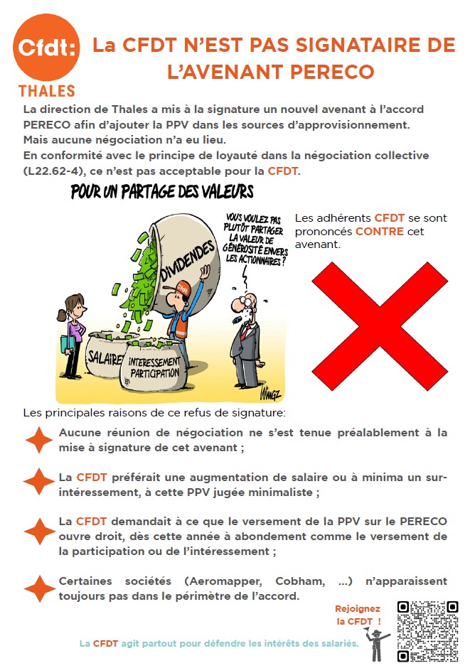 Crée le 22/08/2025 / Par FRANCHOMME NadègeLa CFDT est non signataire du projet d’avenant à l’accord PERECO permettant d’y verser la PPV (Prime de Partage de la Valeur).