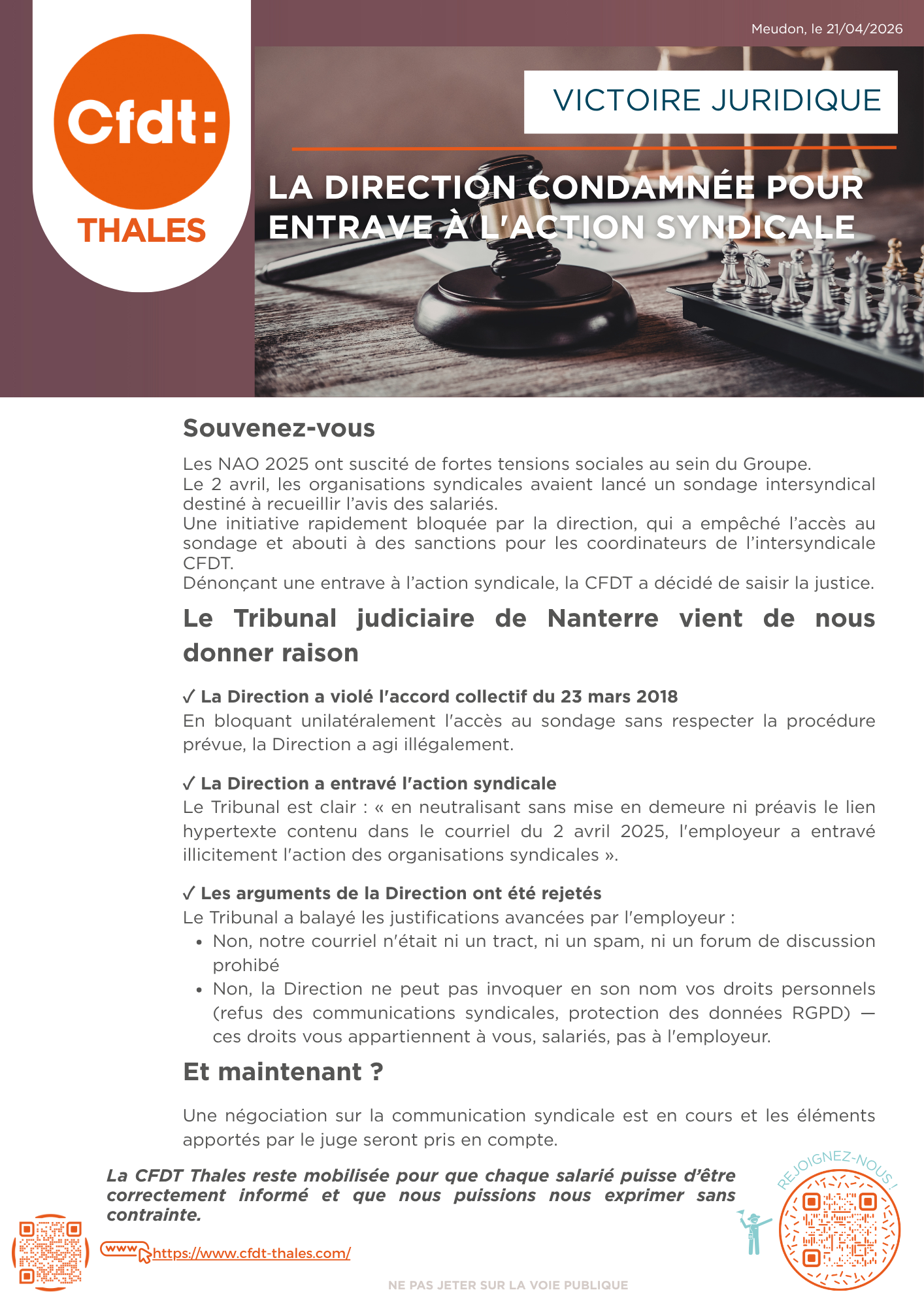 La CFDT Thales a évalué le degré d’application de chaque Accord Groupe. Plusieurs actions ont découlé de cette analyse. Tout d’abord, une mis...